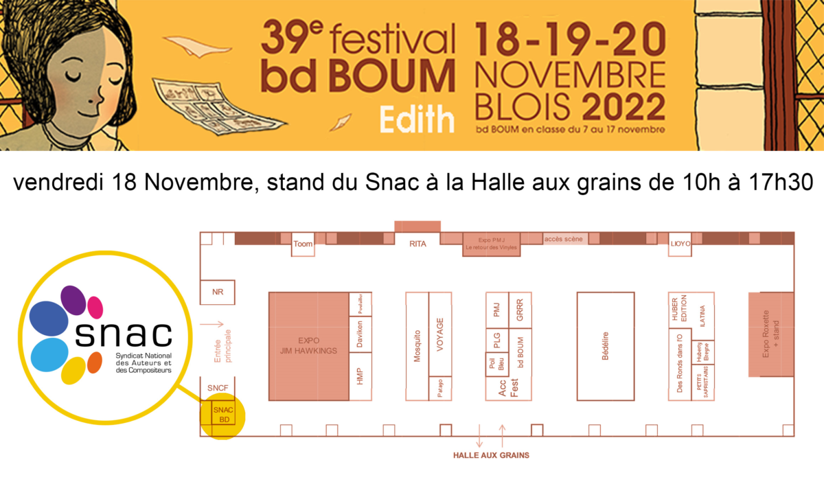 Une permanence juridique pour les auteurs de bande dessinée, adhérents ou non au Snac, se tiendra sur le stand du Snac à la Halle aux grains de 10h à 17h30.