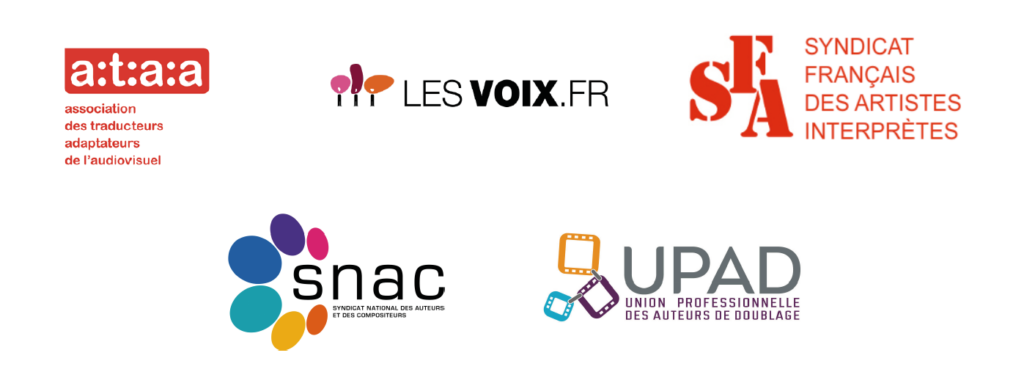 Actualités Le pacte d’engagement éthique Un « Pacte d’engagement éthique pour une accessibilité universelle et pour un travail créatif d’auteurs, d’autrices et d’artistes interprètes » a été signé par les organisations suivantes : L’ATAA (Association des Traducteurs/Adaptateurs de l’Audiovisuel) L’association Les Voix.fr Le SFA (Syndicat Français des Artistes interprètes) Le SNAC (Syndicat National des Auteurs et des Compositeurs) Le SNTPCT : Syndicat National des Techniciens et Travailleurs de la Production Cinématographique et de Télévision (av) L’UNAC : Union Nationale des Auteurs et Compositeurs L’UPAD (Union Professionnelle des Auteurs de Doublage) Lire le pacte