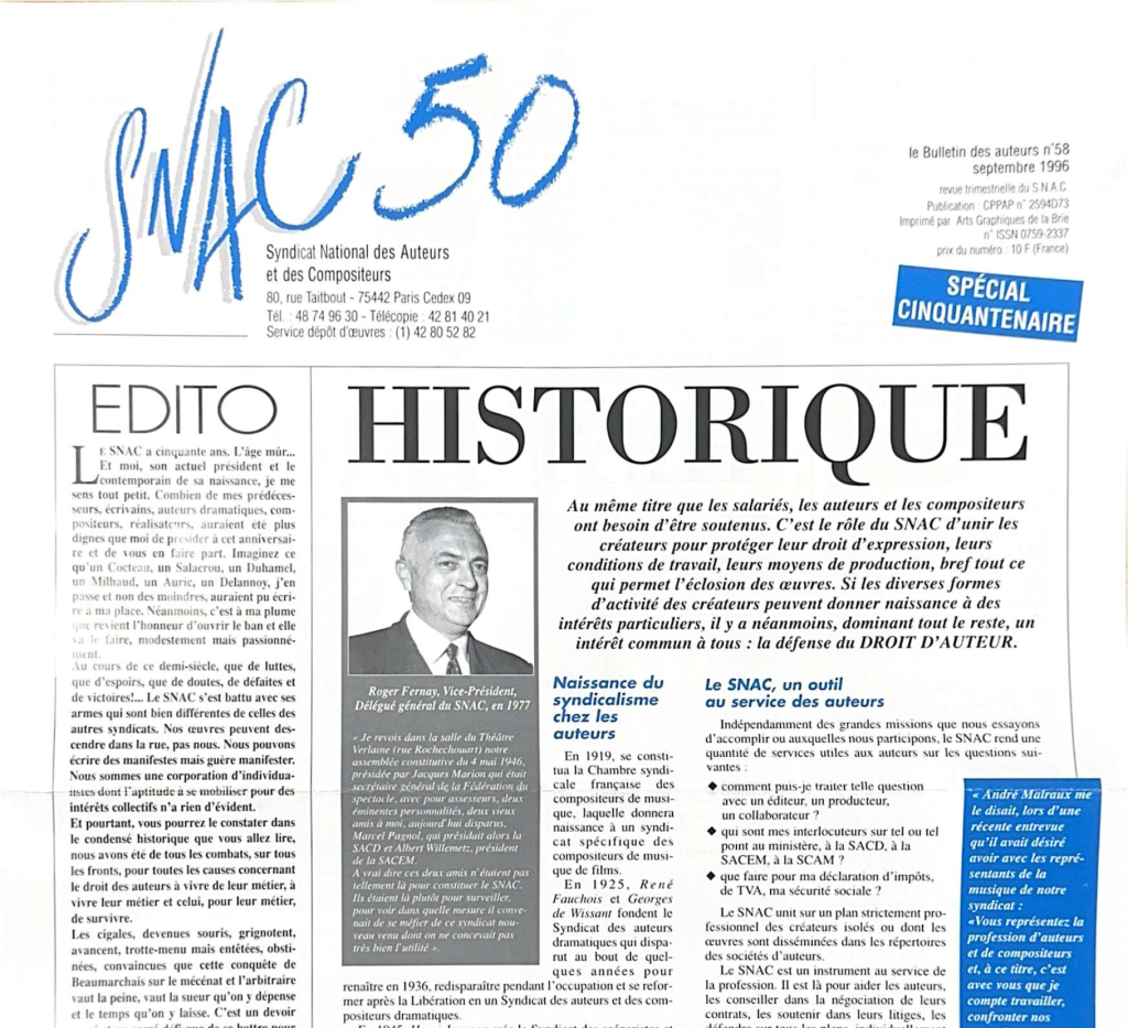 Les responsables de ces cinq organisations d'auteurs prirent une décision, celle de constituer le syndicat national des auteurs et des compositeurs (Snac) par la fusion de leurs organisations en une seule susceptible de réunir tous les auteurs professionnels. se faisait sentir le besoin d'organiser, en marge des sociétés d'auteurs, la défense générale de la profession, d'unir à travers les personnes ce qui se trouve dispersé dans les différents répertoires, de dégager de la notion financière du droit d'auteur la notion de travail que l'on oublie trop souvent, de renforcer cette unité des créateurs intellectuels par des liens de solidarité avec les autres travailleurs de la grande famille du spectacle.